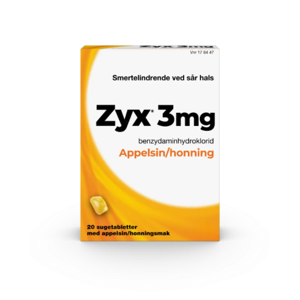 Zyx-sugetabletter med en frisk smak av appelsin og honning er utviklet for å lindre irritasjon i munn og svelg, noe som letter ubehaget når du svelger og snakker. Virkestoffet reduserer obehag, samtig som det gir en lett, lokalbedøvende effekt som bedøver det irriterte området.